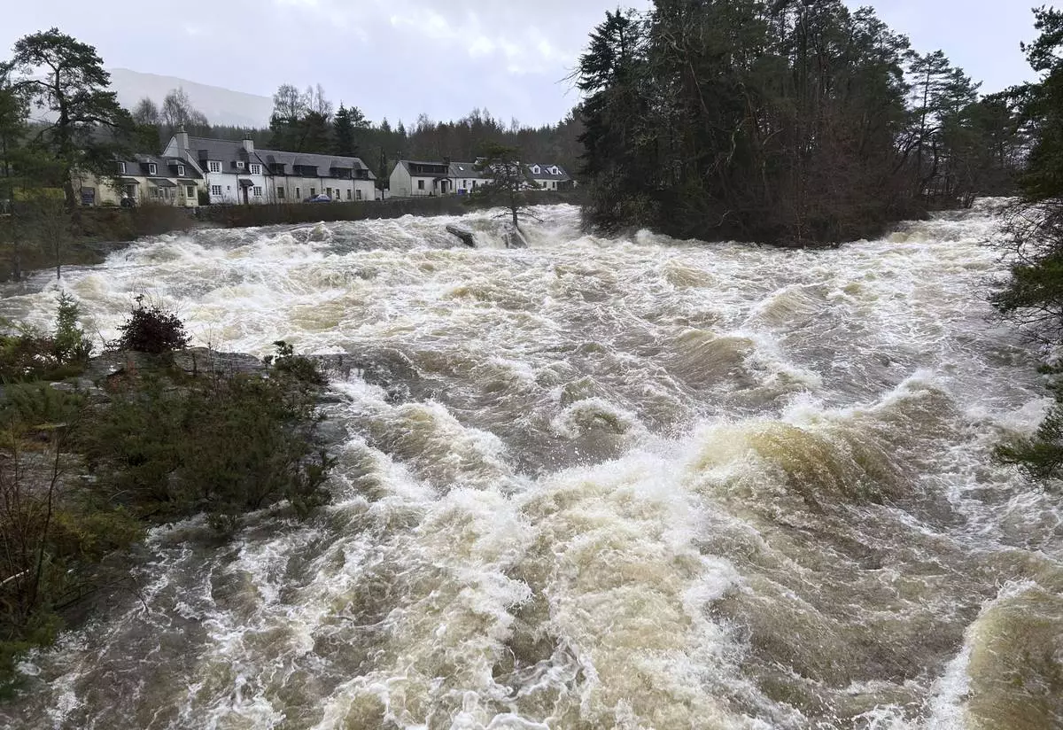 White water at the Falls of Dochart in Killin, Stirlingshire, as snow, rain and wind warnings are in force and are expected to cause travel issues on New Year's Eve on Tuesday, Dec. 31, 2024. (Laura Paterson/PA via AP)