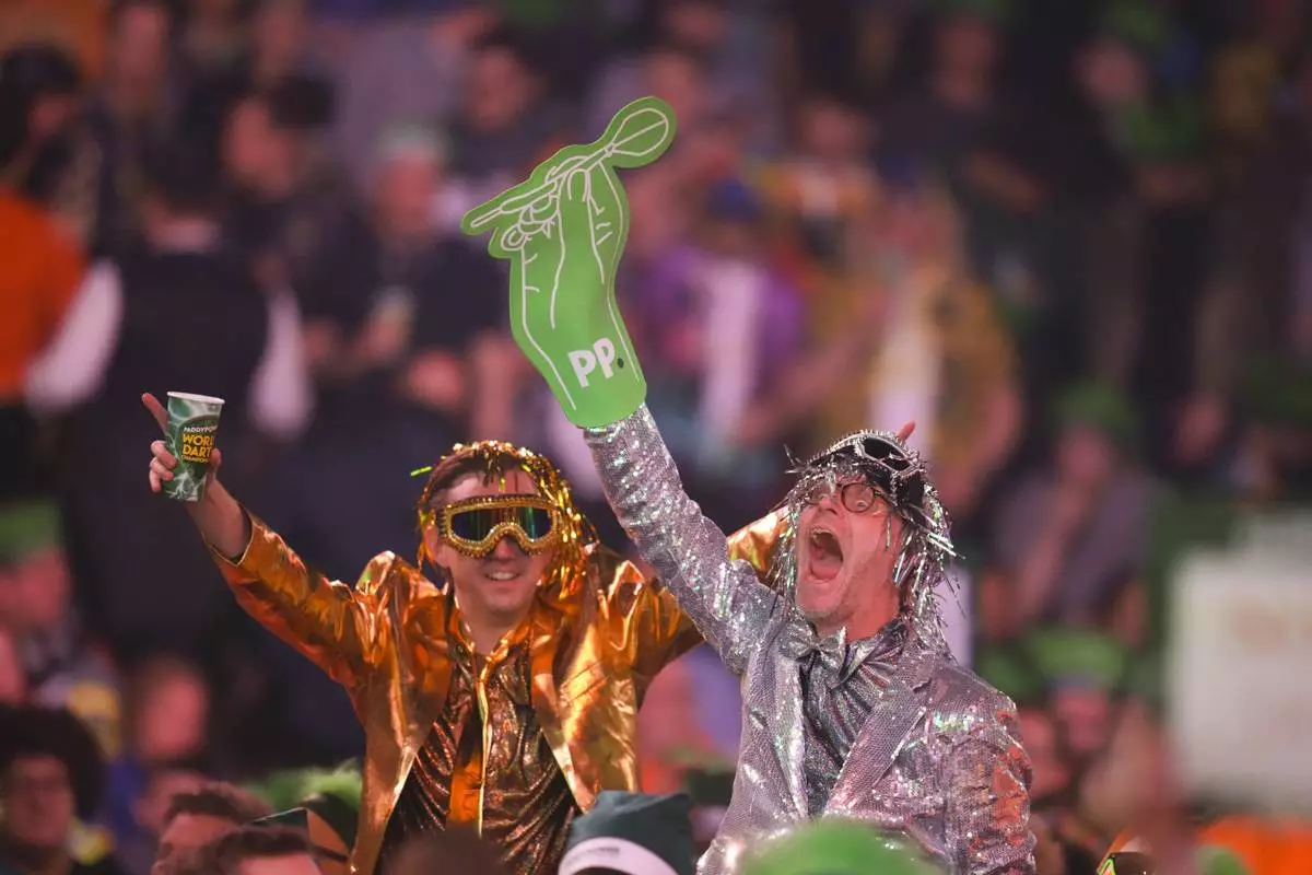 Fans cheer during the final of the World Darts Championship at Alexandra Palace in London, Friday, Jan. 3, 2025. (AP Photo/Kirsty Wigglesworth)