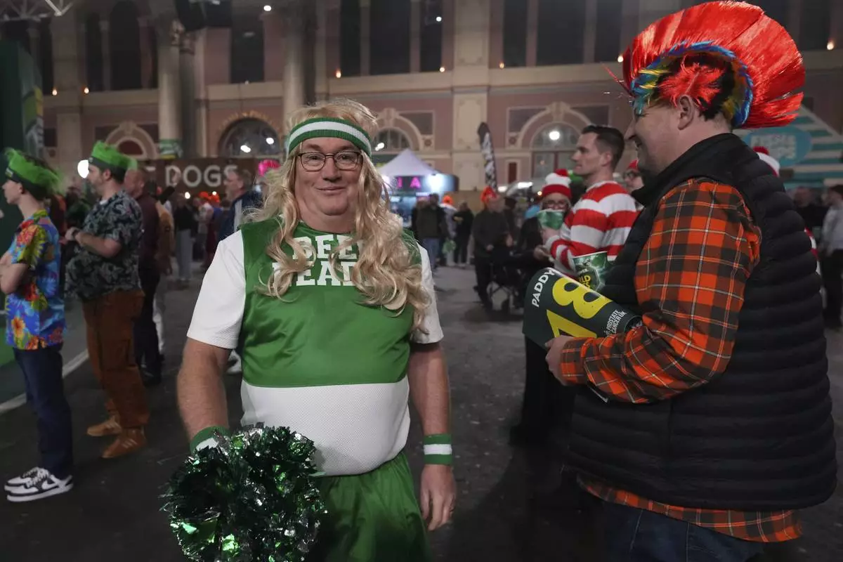 Fans dressed in costumes are seen around the fan village before the start of the quarter final match between Peter Wright of Scotland and Stephen Bunting of England, at the World Darts Championship in London, Wednesday, Jan. 1, 2025.(AP Photo/Alberto Pezzali)