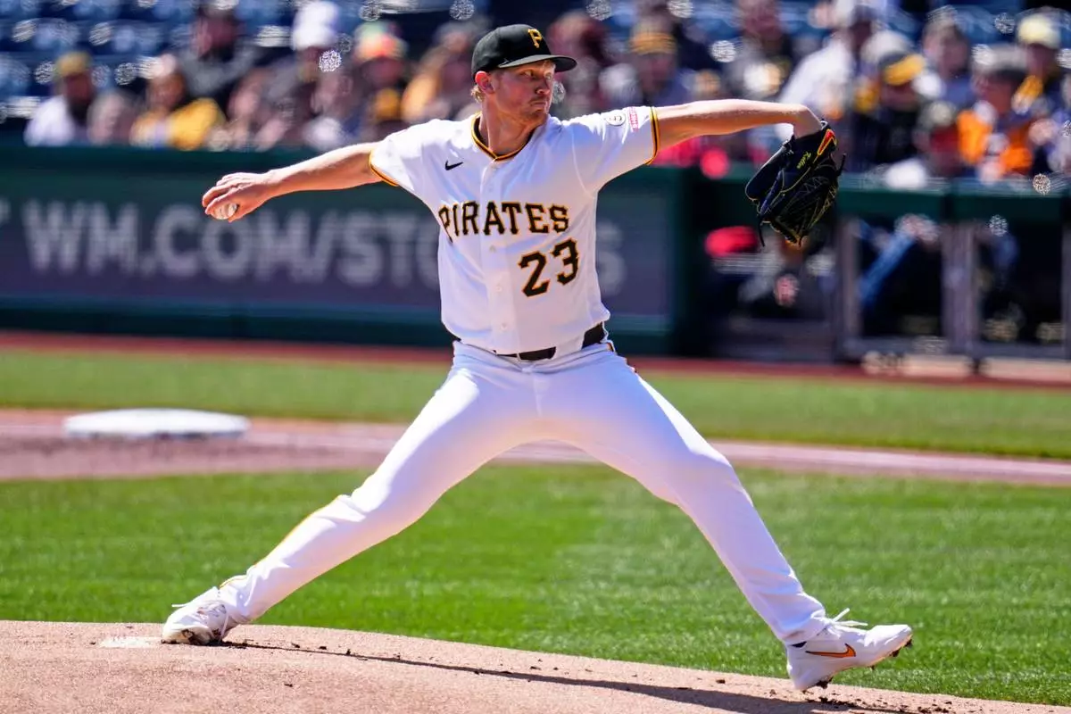 Pittsburgh Pirates pitcher Mitch Keller delivers during the first inning of a baseball game San Diego Padres in Pittsburgh, Wednesday, April 8, 2026. (AP Photo/Gene J. Puskar)