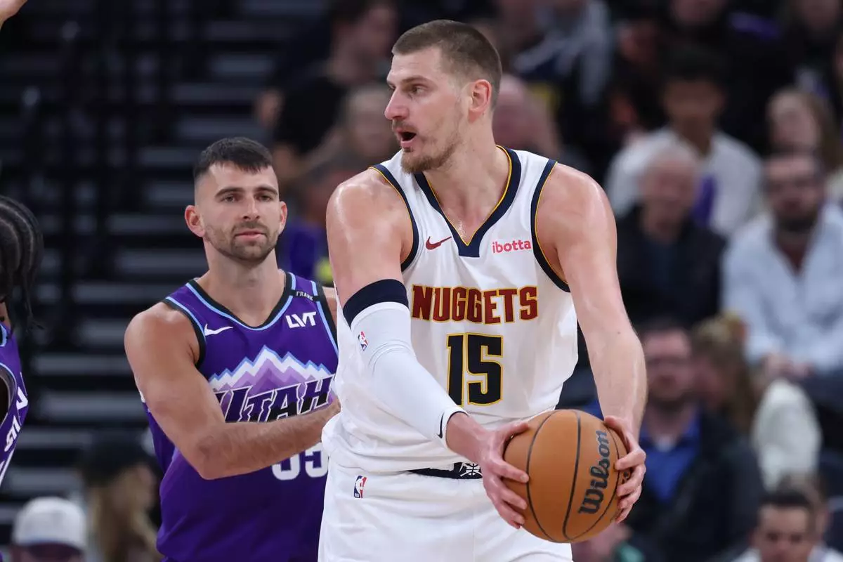 Denver Nuggets center Nikola Jokic (15) holds the ball away from Utah Jazz guard John Konchar during the first half of an NBA basketball game, Wednesday, April 1, 2026, in Salt Lake City. (AP Photo/Rob Gray)