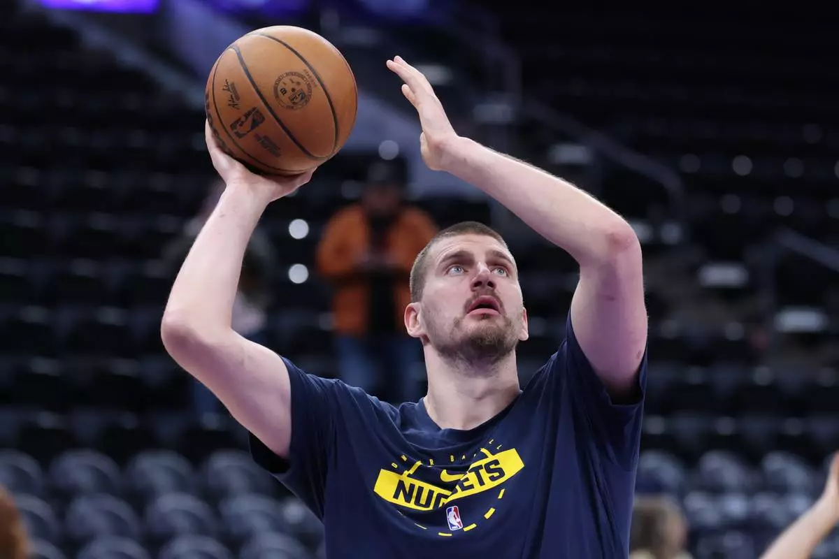 Denver Nuggets center Nikola Jokic warms up before an NBA basketball game against the Utah Jazz, Wednesday, April 1, 2026, in Salt Lake City. (AP Photo/Rob Gray)