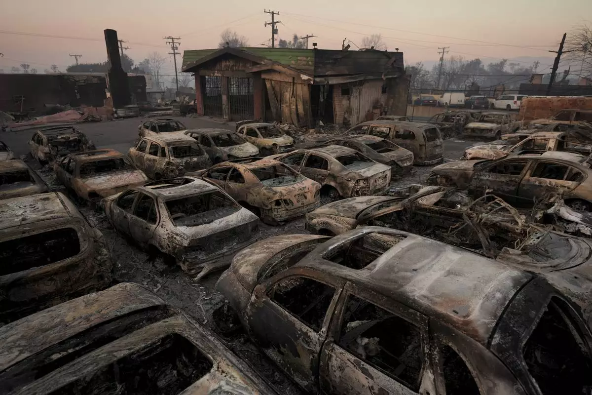 Cars are left charred inside a dealership in the aftermath of the Eaton Fire Friday, Jan. 10, 2025 in Altadena, Calif. (AP Photo/Jae C. Hong)