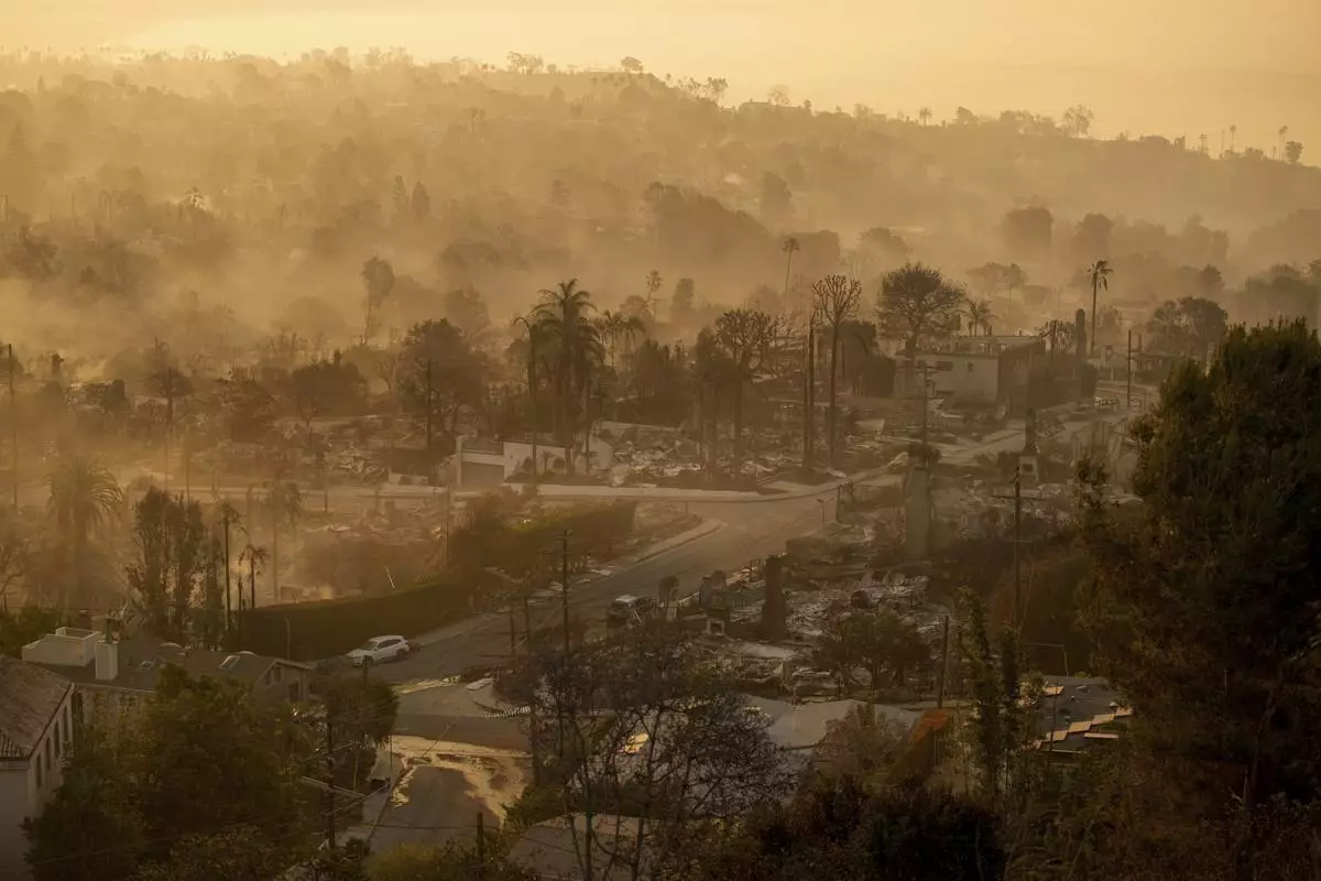 The devastation of the Palisades Fire is seen in the early morning in the Pacific Palisades neighborhood of Los Angeles, Friday, Jan. 10, 2025. (AP Photo/John Locher)