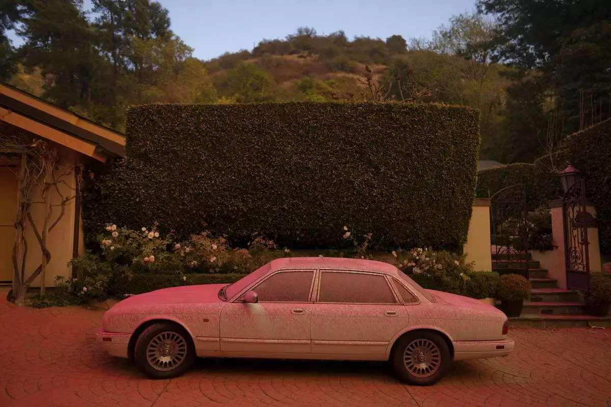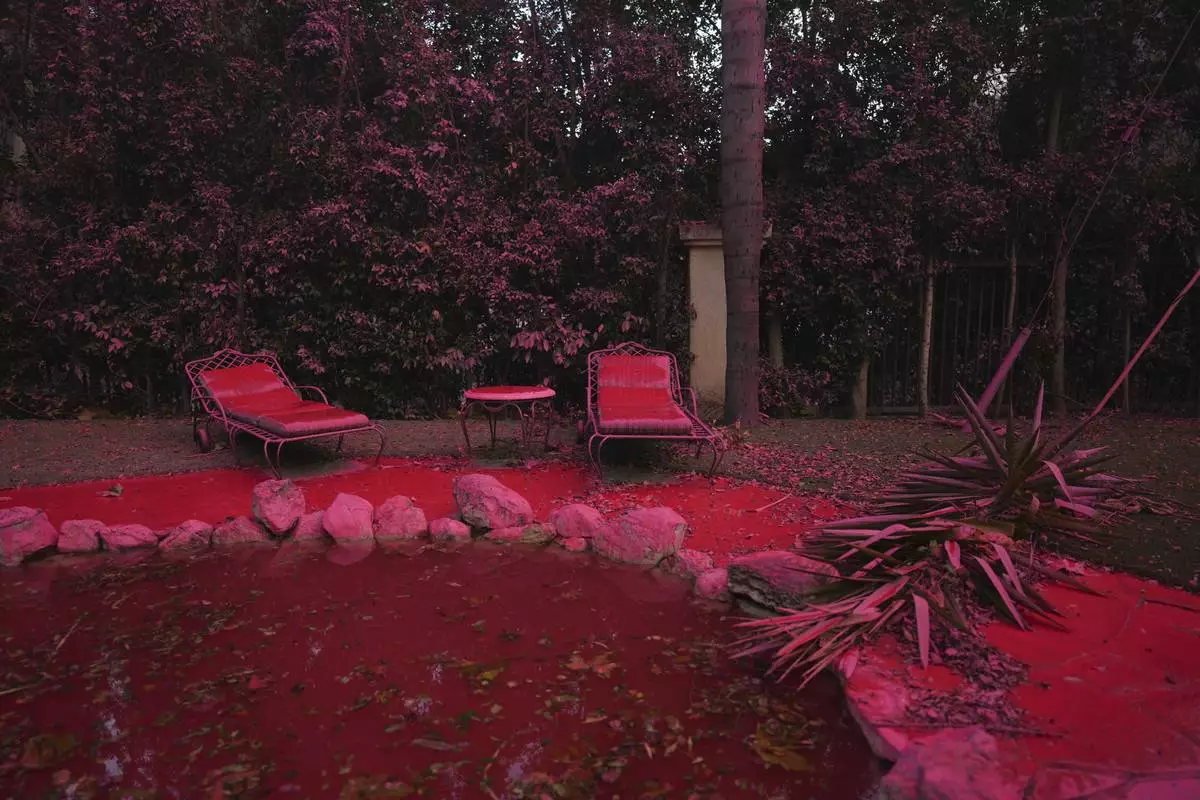 Fire retardant covers a backyard in Mandeville Canyon during the Palisades Fire, Saturday, Jan. 11, 2025, in Los Angeles. (AP Photo/Eric Thayer)