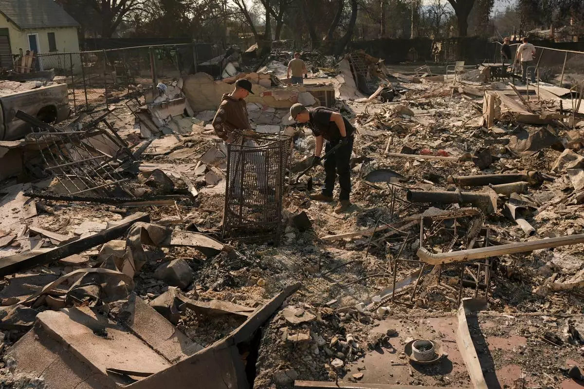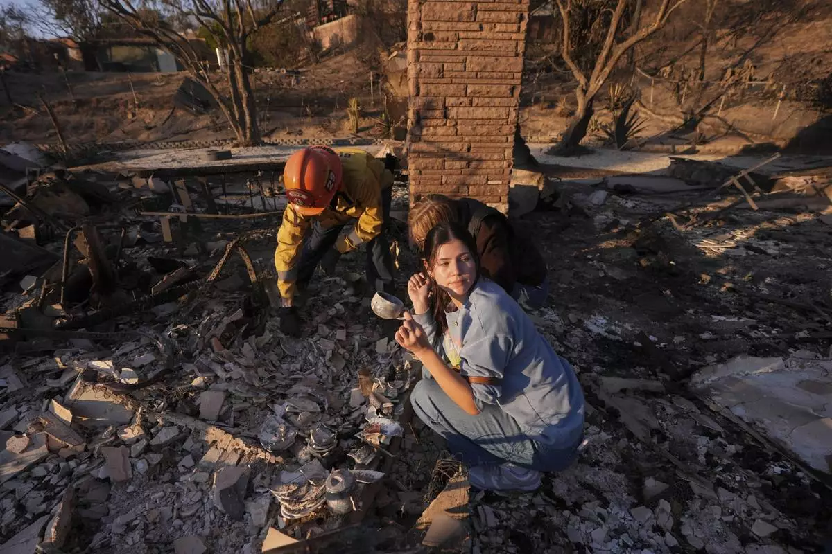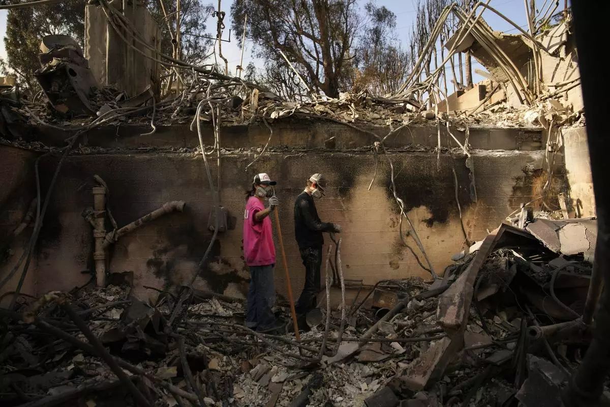 Kaegan Baron, left, and Oliver Braren sift through the home of Kaegan's mother after it was destroyed by the Palisades Fire in the Pacific Palisades neighborhood of Los Angeles, Saturday, Jan. 11, 2025. (AP Photo/John Locher)