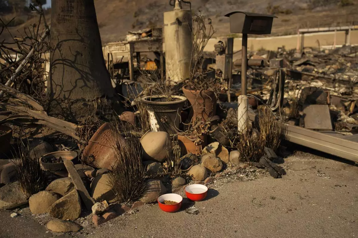 A bowl of cat food and water, placed by Kevin Marshall, sits near his mother's property, which was destroyed by the Palisades Fire in the Pacific Palisades neighborhood of Los Angeles, Saturday, Jan. 11, 2025. Marshall placed the bowls for Simba, a cat his mother took care of. (AP Photo/John Locher)