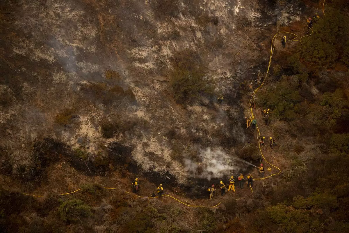 A group of firefighters traverse a steep hill while battling the Palisades Fire in the Mandeville Canyon neighborhood of Los Angeles, Calif., Saturday, Jan. 11, 2025. (Stephen Lam/San Francisco Chronicle via AP)