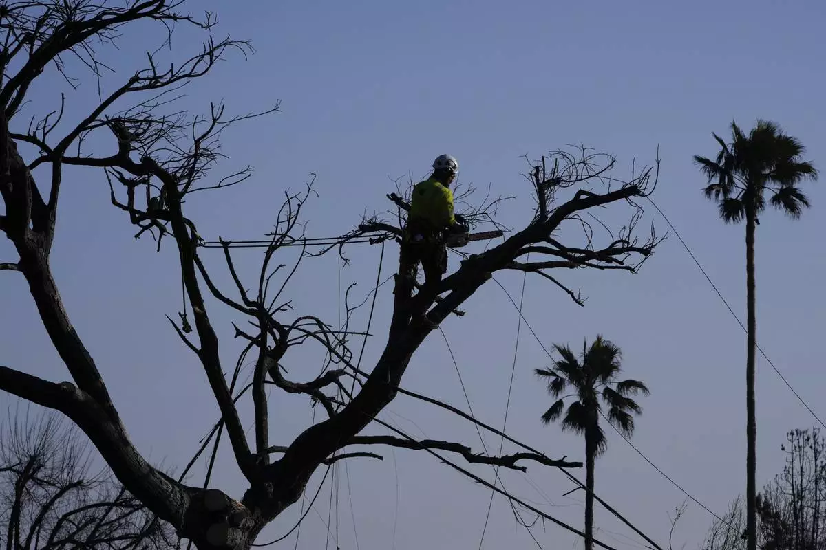 A worker trims a tree burnt by the Eaton Fire on Saturday, Jan. 11, 2025, in Altadena, Calif. (AP Photo/Mark J. Terrill)