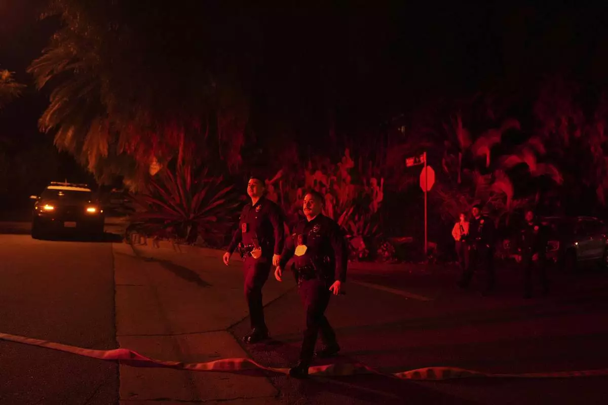 Police officers check on homes to evacuate residents near the Palisades Fire in Mandeville Canyon, Friday, Jan. 10, 2025, in Los Angeles. (AP Photo/Eric Thayer)