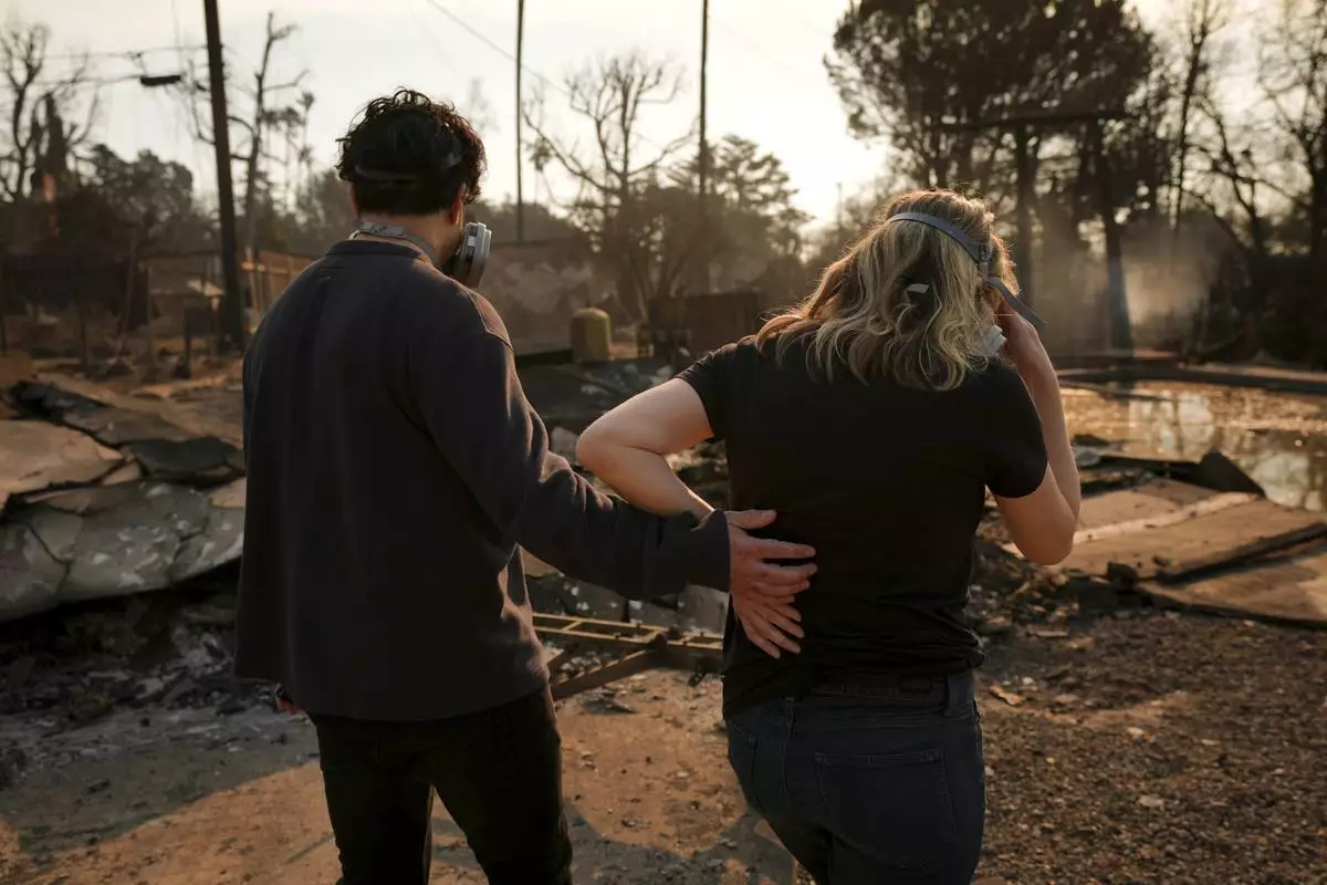 Homeowners Sohrab Nafici, left, and Christine Meinders return to their fire-ravaged neighborhood in the aftermath of the Eaton Fire Friday, Jan. 10, 2025 in Altadena, Calif. (AP Photo/Jae C. Hong)