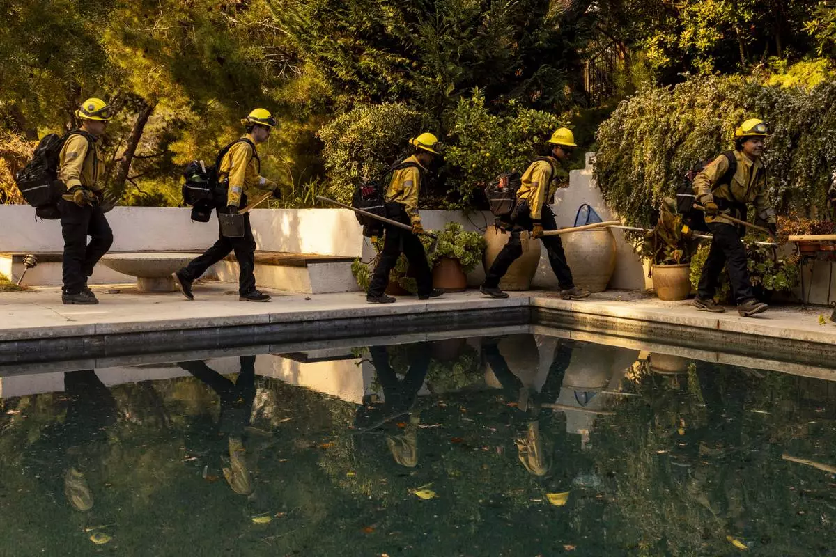 A Cal Fire hand crew walks past a swimming pool toward their next assignment during the Palisades Fire in the Mandeville Canyon neighborhood of Los Angeles, Calif., Saturday, Jan. 11, 2025. (Stephen Lam/San Francisco Chronicle via AP)