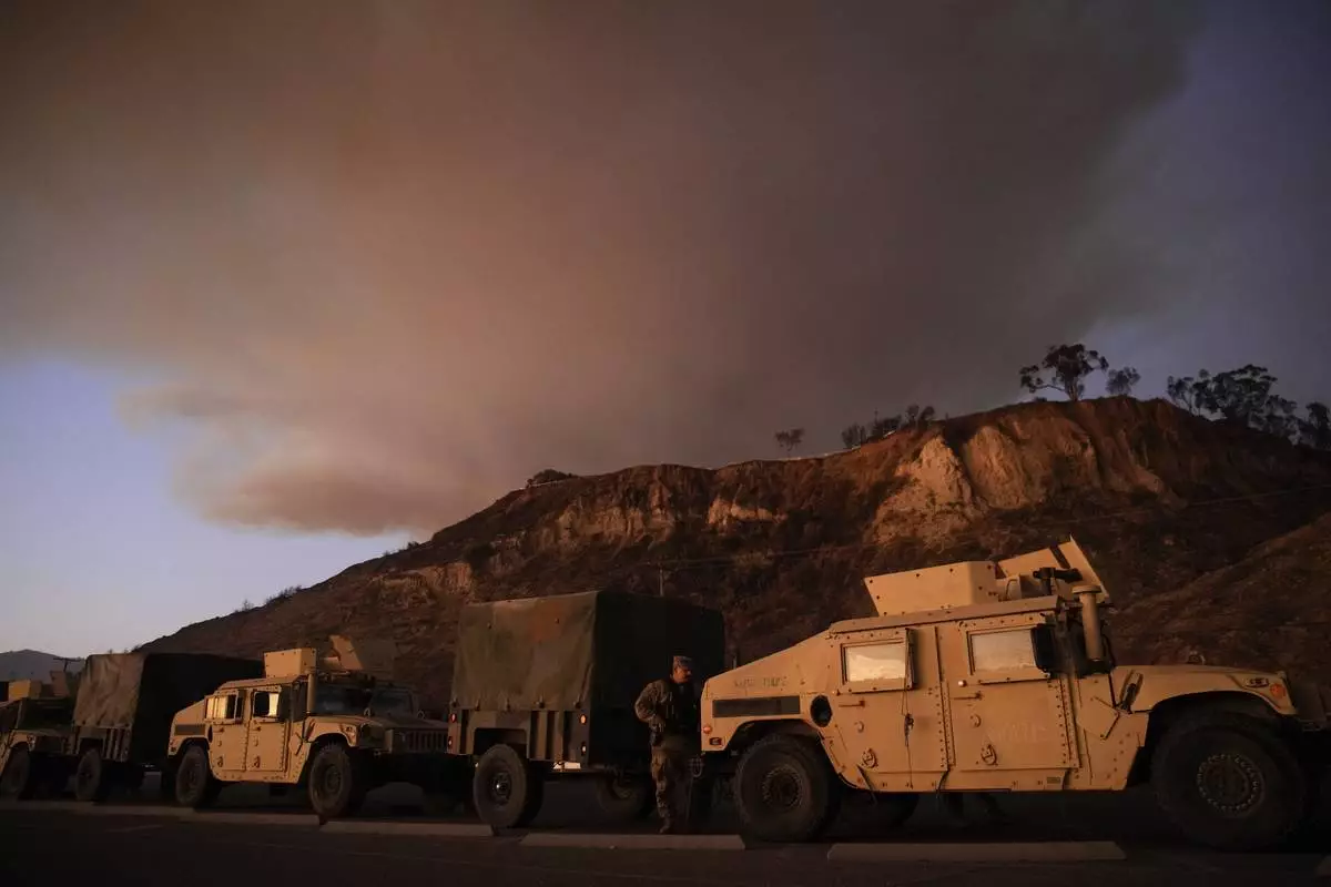 California National Guard line up along the Pacific Coast Highway as a plume of smoke rises from the Palisades Fire on Friday, Jan. 10, 2025, in the Pacific Palisades section of Los Angeles. (AP Photo/John Locher)