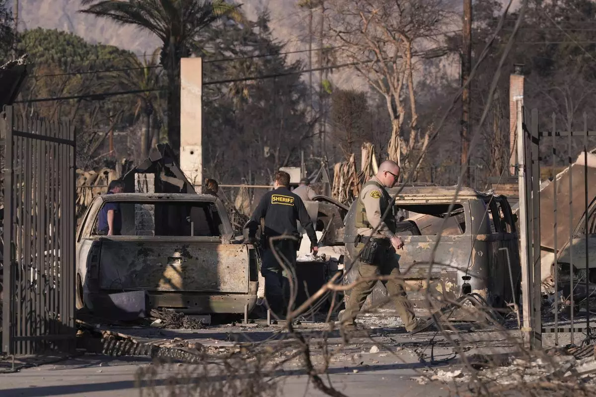 A medical examiner and sheriff's deputies check on a home destroyed by the Eaton Fire on Saturday, Jan. 11, 2025, in Altadena, Calif. (AP Photo/Mark J. Terrill)