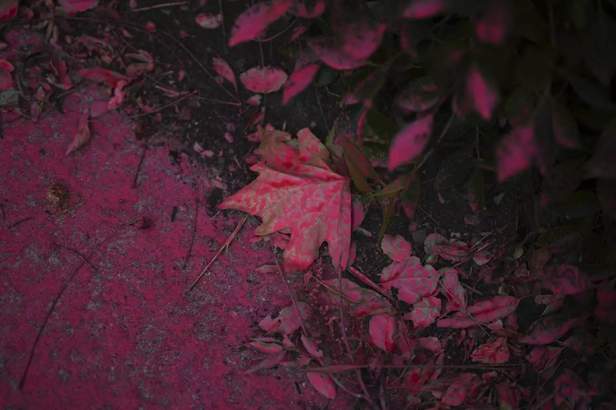Fire retardant covers leaves as crews battle the Palisades Fire in Mandeville Canyon, Saturday, Jan. 11, 2025, in Los Angeles. (AP Photo/Eric Thayer)