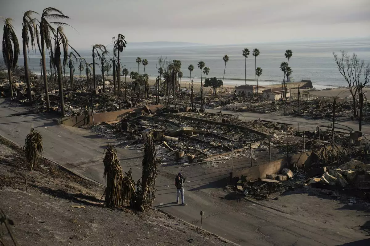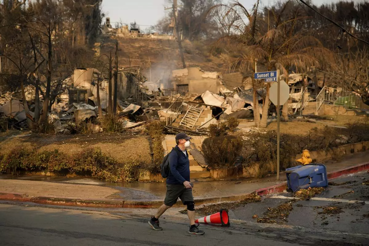A person walks past damage from the Palisades Fire on Friday, Jan. 10, 2025, in the Pacific Palisades section of Los Angeles. (AP Photo/John Locher)