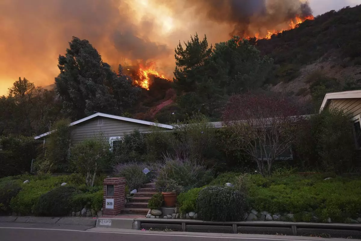 The Palisades Fire burns above a home in Mandeville Canyon, Saturday, Jan. 11, 2025, in Los Angeles. (AP Photo/Eric Thayer)