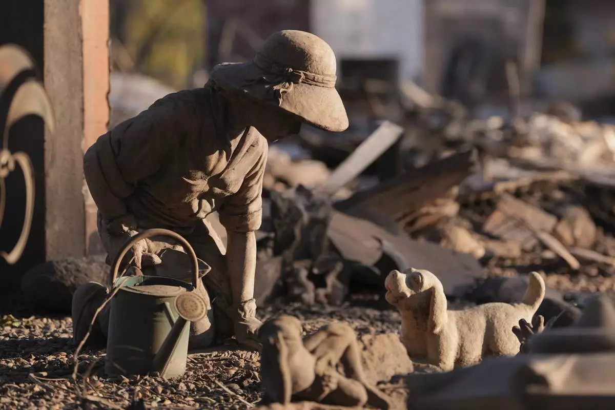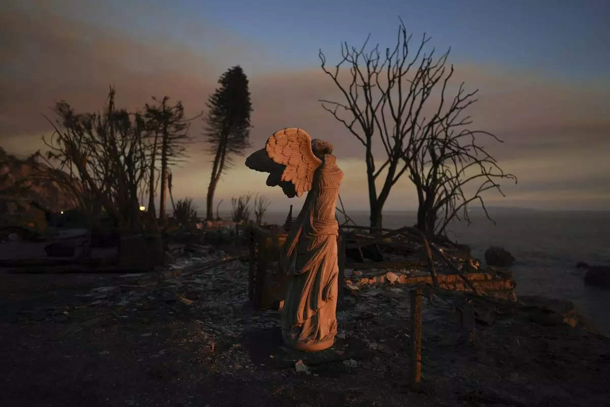 A statue stands amid damage from the Palisades Fire on Friday, Jan. 10, 2025, in Malibu, Calif. (AP Photo/Eric Thayer)