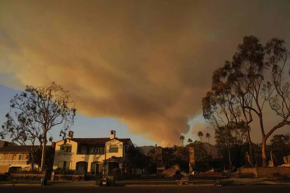 Smoke from the Palisades Fire rises over a ridge as seen from the Encino section of Los Angeles on Saturday, Jan. 11, 2025. (AP Photo/Richard Vogel)