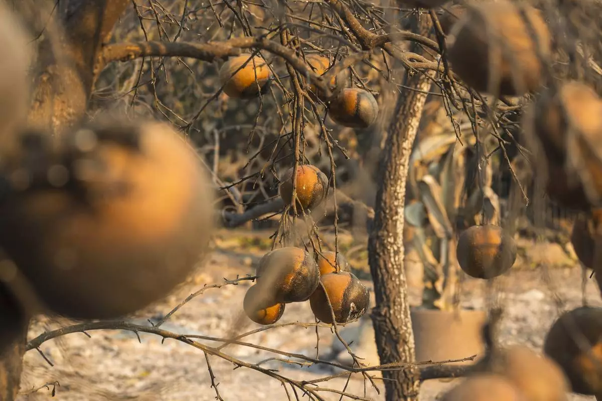 Citrus fruit burnt in the Eaton Fire in Altadena, Calif., Friday, Jan. 10, 2025. (AP Photo/Nic Coury)