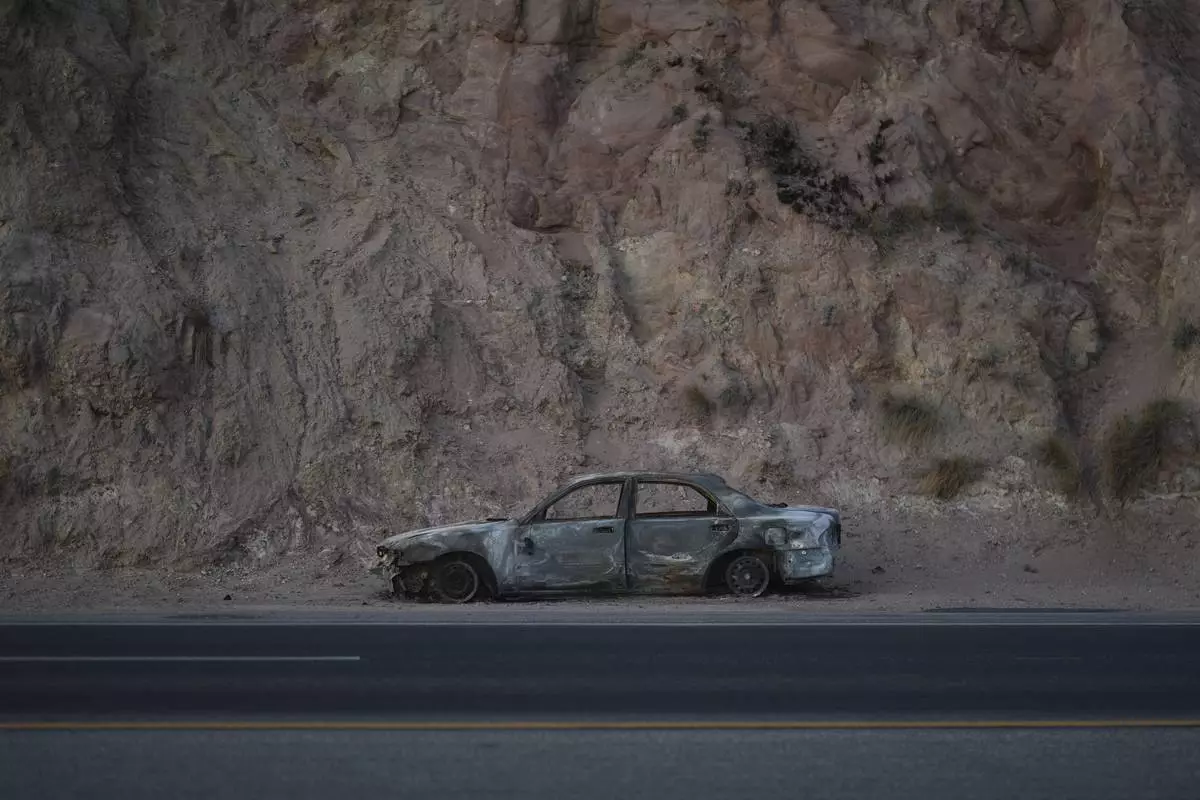 A car destroyed by the Palisades Fire sits on the side of a road Friday, Jan. 10, 2025, in Malibu, Calif. (AP Photo/Eric Thayer)