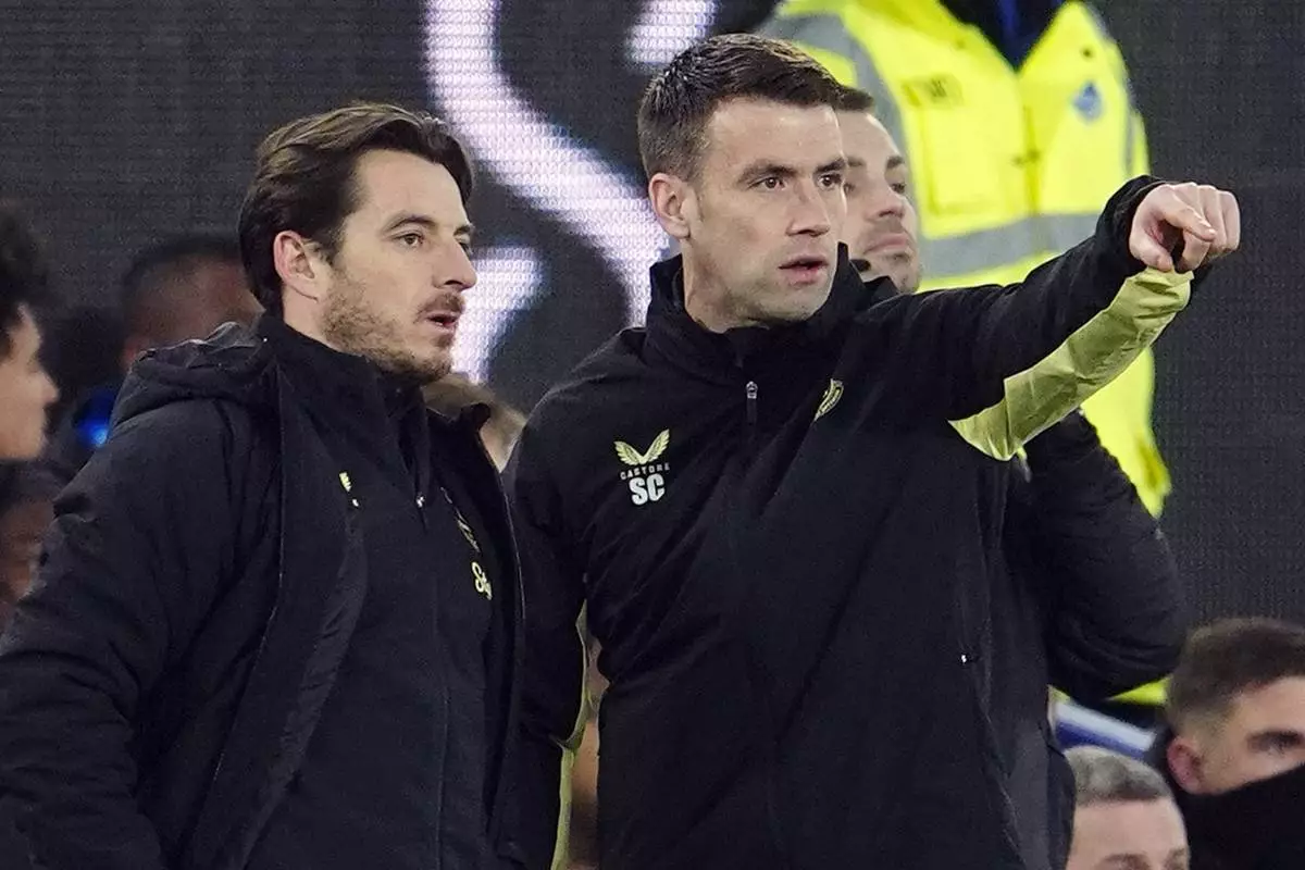 Everton caretaker managers Leighton Baines, left, and Seamus Coleman consult on the touchline during the English FA Cup third round soccer match between Everton and Peterborough United at Goodison Park, Liverpool, England, Thursday Jan. 9, 2025. (Peter Byrne/PA via AP)