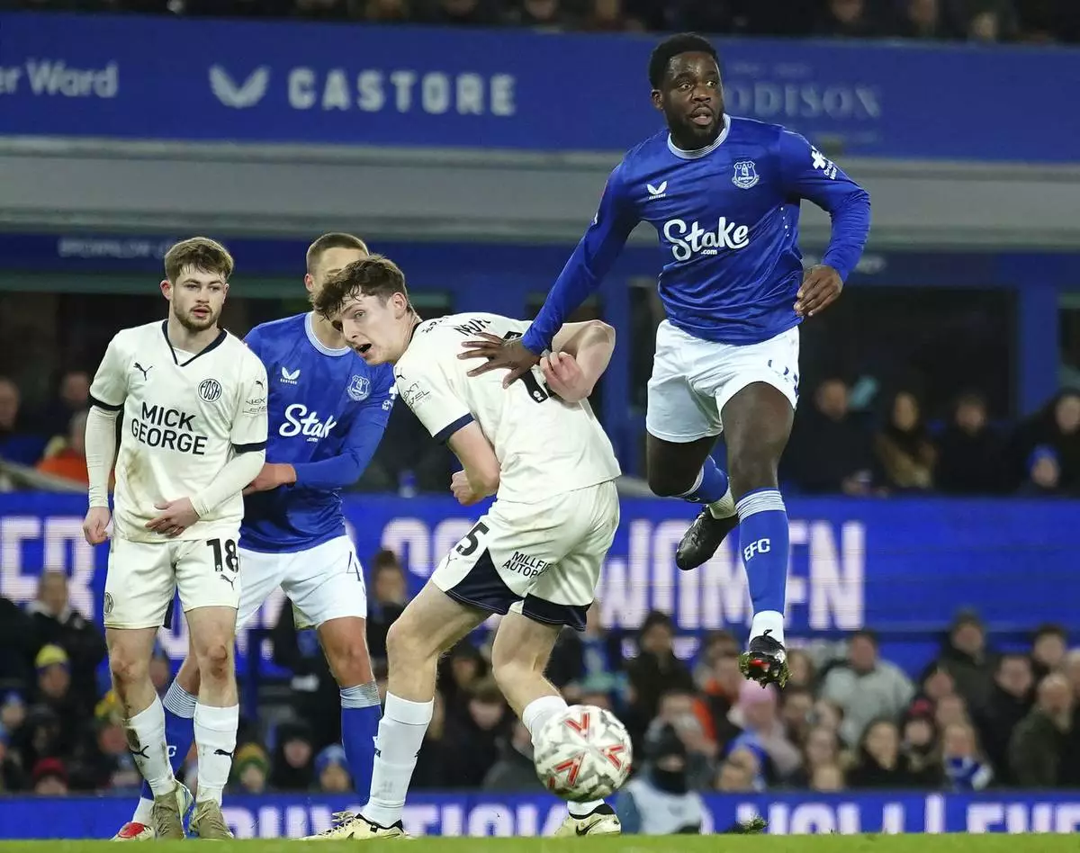 Everton's Orel Mangala, right, and Peterborough United's George Nevett in action during the English FA Cup third round soccer match between Everton and Peterborough United at Goodison Park, Liverpool, England, Thursday Jan. 9, 2025. (Peter Byrne/PA via AP)