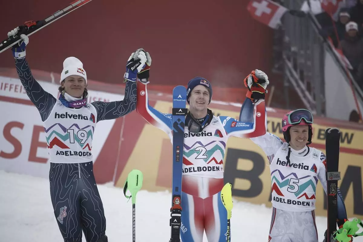 From left, second placed Brazil' Lucas Braathen, the winner France's Clement Noel and third placed Norway's Henrik Kristoffersen celebrate after an alpine ski, men's World Cup slalom race, in Adelboden, Switzerland, Saturday, Jan. 11, 2025. (AP Photo/Gabriele Facciotti)