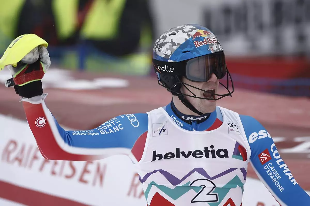 France's Clement Noel reacts after winning an alpine ski, men's World Cup slalom race, in Adelboden, Switzerland, Saturday, Jan. 11, 2025. (AP Photo/Gabriele Facciotti)