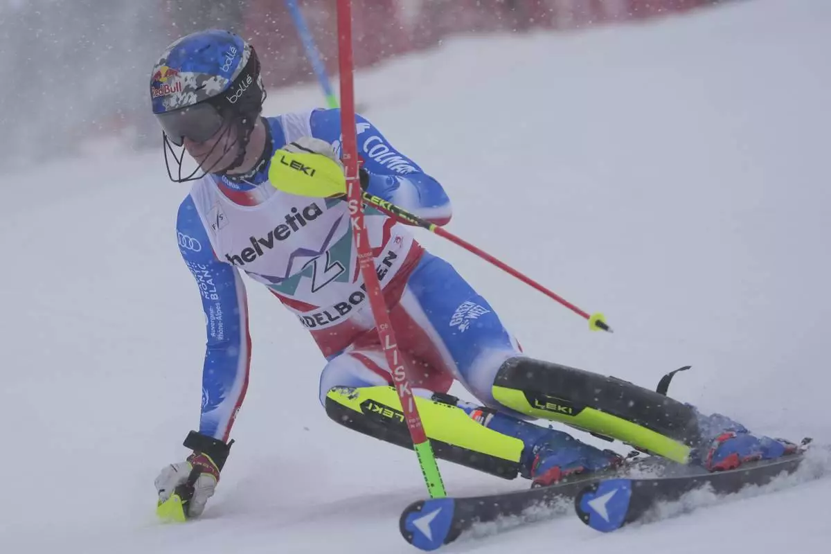 France's Clement Noel speeds down the course during an alpine ski, men's World Cup slalom race, in Adelboden, Switzerland, Saturday, Jan. 11, 2025. (AP Photo/Giovanni Zenoni)