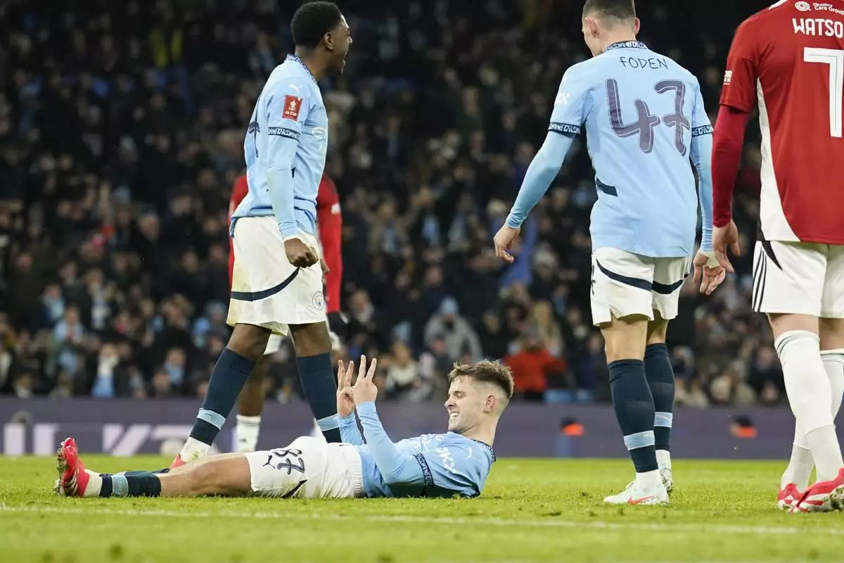Manchester City's James McAtee, bottom, celebrates after scoring his side's eighth goal during the English FA Cup soccer match between Manchester City and Salford City at Etihad Stadium in Manchester, Saturday, Jan. 11, 2025. (AP Photo/ Dave Thompson)