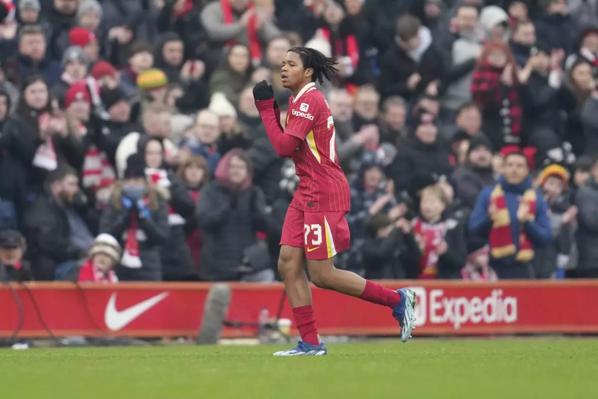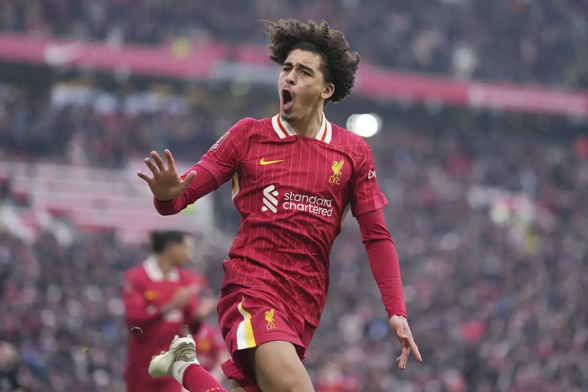 Liverpool's Jayden Danns celebrates after scoring his side's third goal during the FA Cup soccer match between Liverpool and Accrington Stanley at the Anfield stadium in Liverpool, England, Saturday, Jan. 11, 2025. (AP Photo/Jon Super)