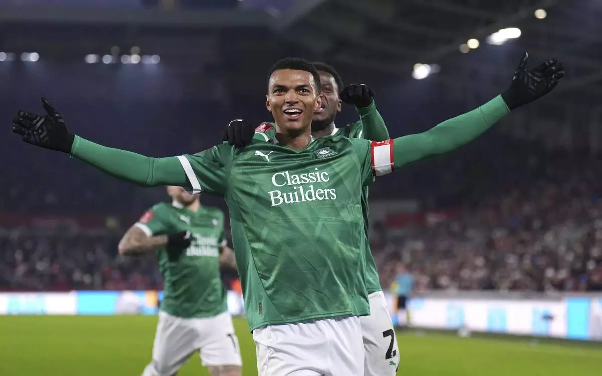 Plymouth Argyle's Morgan Whittaker celebrates scoring his side's first goal of the game, during the English FA Cup third round soccer match between Brentford and Plymouth Argyle, at the Gtech Community Stadium, in London, Saturday, Jan. 11, 2025. ( John Walton/PA via AP)
