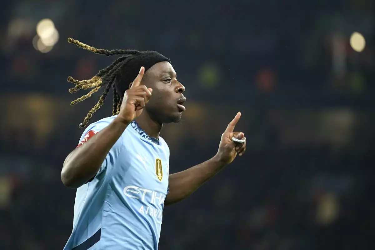 Manchester City's Jeremy Doku celebrates after scoring during the English FA Cup soccer match between Manchester City and Salford City at Etihad Stadium in Manchester, Saturday, Jan. 11, 2025. (AP Photo/ Dave Thompson)
