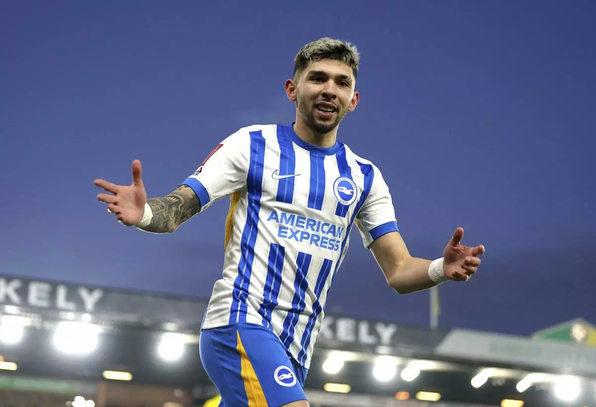 Brighton and Hove Albion's Julio Enciso celebrates scoring during the English FA Cup third round soccer match between Norwich City and Brighton and Hove Albion, at Carrow Road, in Norwich, England, Saturday, Jan. 11, 2025. (Joe Giddens/PA via AP)
