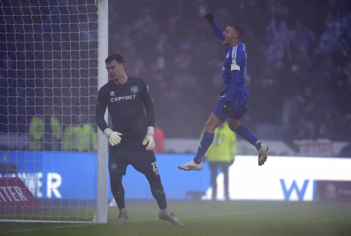 Leicester City's Jamie Vardy celebrates scoring his side's fourth goal, during the English FA Cup third round soccer match between Leicester City and Queen Parks Rangers at the King Power Stadium, in Leicester, England, Saturday, Jan. 11, 2025. (Mike Egerton/PA via AP)