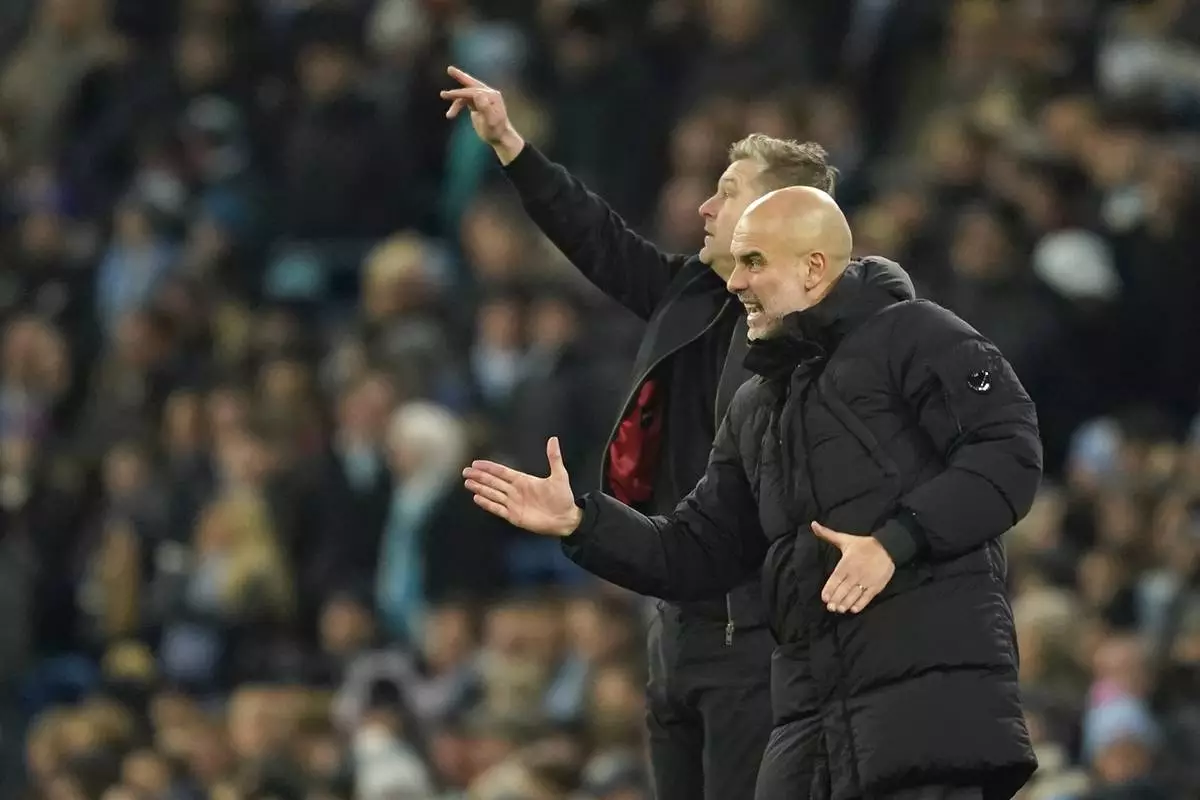 Manchester City's head coach Pep Guardiola, right, and Salford head coach Karl Robinson give instructions from the side line during the English FA Cup soccer match between Manchester City and Salford City at Etihad Stadium in Manchester, Saturday, Jan. 11, 2025. (AP Photo/ Dave Thompson)