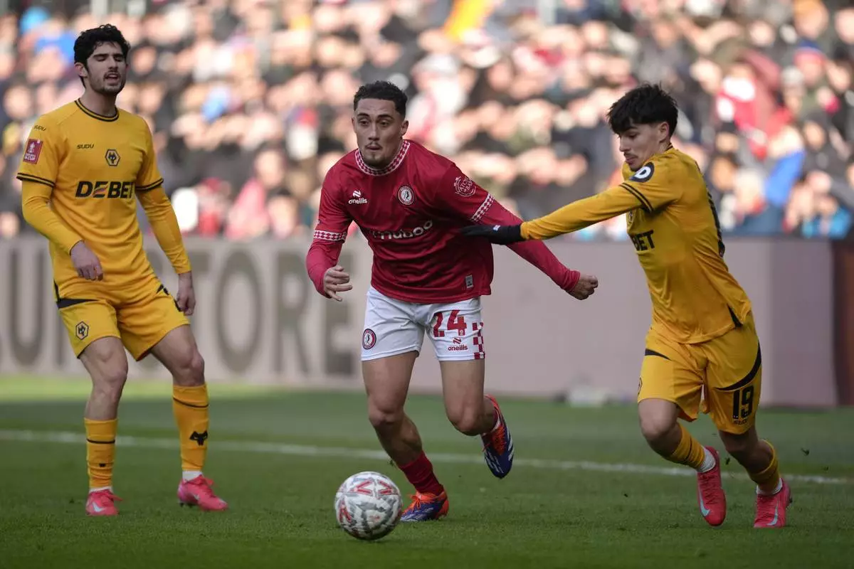 Bristol City's Haydon Roberts, center and Wolverhampton Wanderers' Rodrigo Gomes, right, vie for the ball, during the English FA Cup third round soccer match between Bristol City and Wolverhampton Wanderers, at Ashton Gate, in Bristol, England, Saturday, Jan. 11, 2025. (Nick Potts/PA via AP)