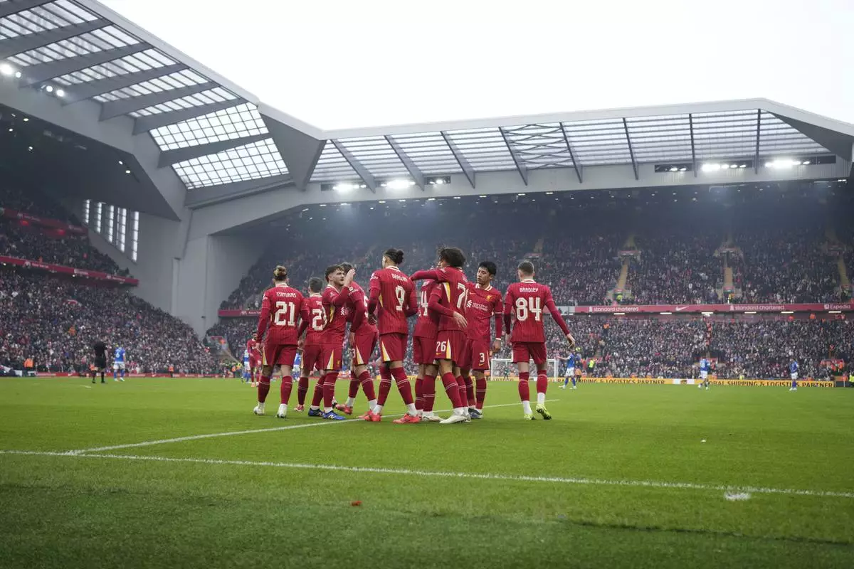 Liverpool's Jayden Danns, third right, celebrates with teammates after scoring his side's third goal during the FA Cup soccer match between Liverpool and Accrington Stanley at the Anfield stadium in Liverpool, England, Saturday, Jan. 11, 2025. (AP Photo/Jon Super)