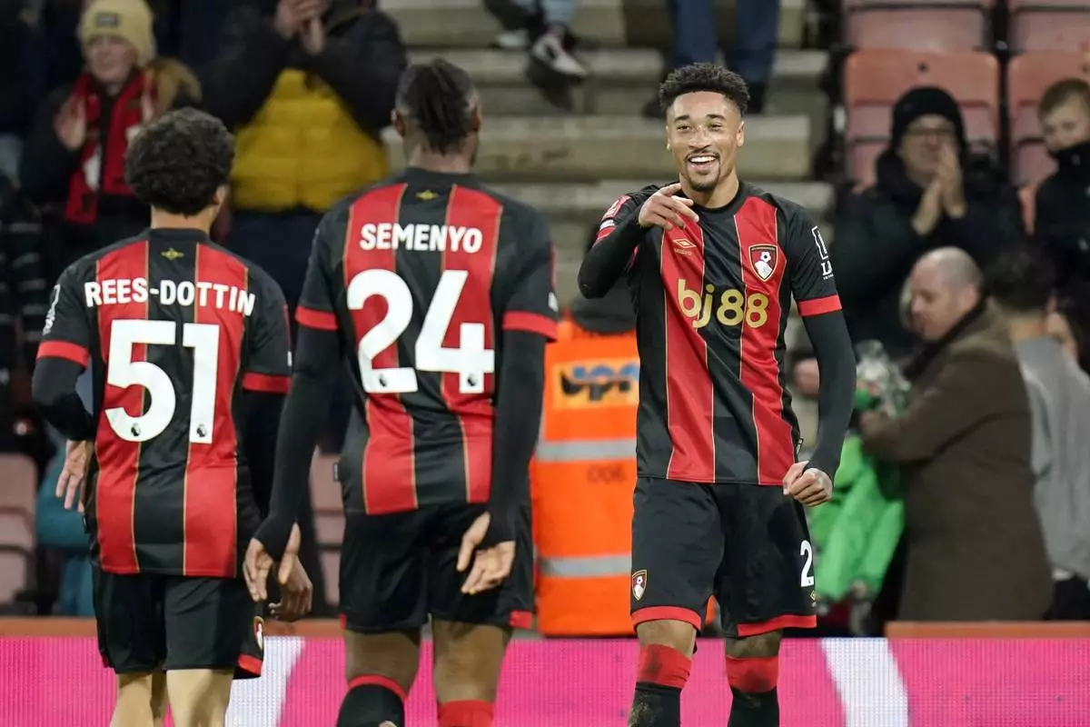 Bournemouth's Daniel Jebbison, right, celebrates scoring during the English FA Cup third round soccer match between Bournemouth and West Bromwich Albion at the Vitality Stadium, Bournemouth, England, Saturday Jan. 11, 2025. (Andrew Matthews/PA via AP)
