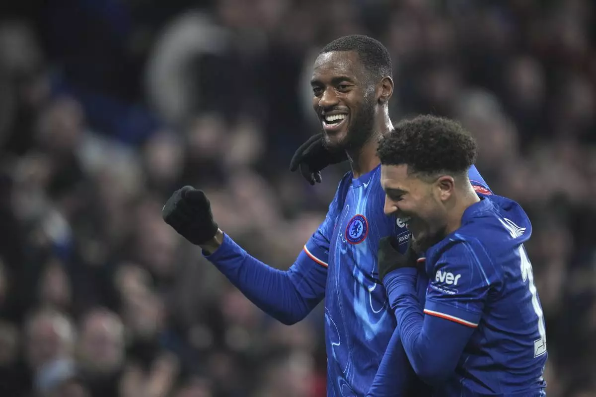 Chelsea's Tosin Adarabioyo celebrates with Chelsea's Jadon Sancho after scoring his side's third goal during the English FA Cup soccer match between Chelsea and Morecambe at Stamford Bridge stadium in London, Saturday, Jan. 11, 2025. (AP Photo/ Kin Cheung)