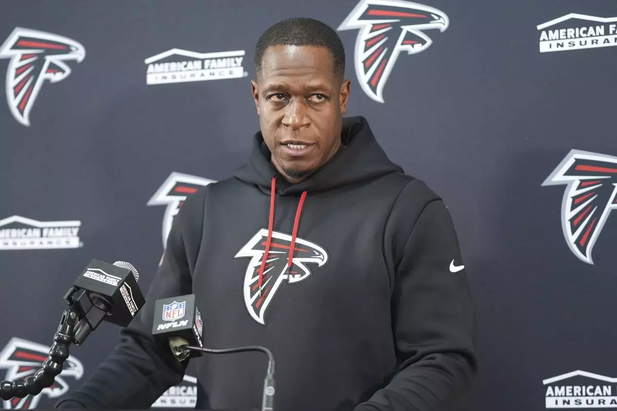 Atlanta Falcons head coach Raheem Morris talks to reporters after an NFL football game, Sunday, Dec. 29, 2024, in Landover, Md. The Commanders won in overtime 30-24. (AP Photo/Stephanie Scarbrough)