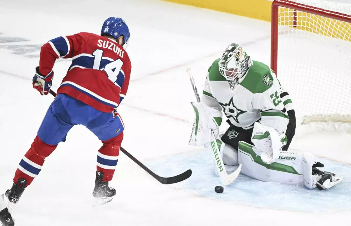 Montreal Canadiens' Nick Suzuki (14) moves in on Dallas Stars goaltender Jake Oettinger during second period NHL hockey action in Montreal, Saturday, January 11, 2025. (Graham Hughes/The Canadian Press via AP)