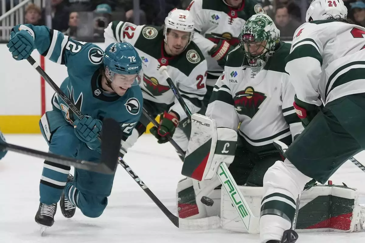 San Jose Sharks left wing William Eklund (72) reaches for the puck over Minnesota Wild defenseman Zach Bogosian (24) during the first period of an NHL hockey game in San Jose, Calif., Saturday, Jan. 11, 2025. (AP Photo/Jeff Chiu)