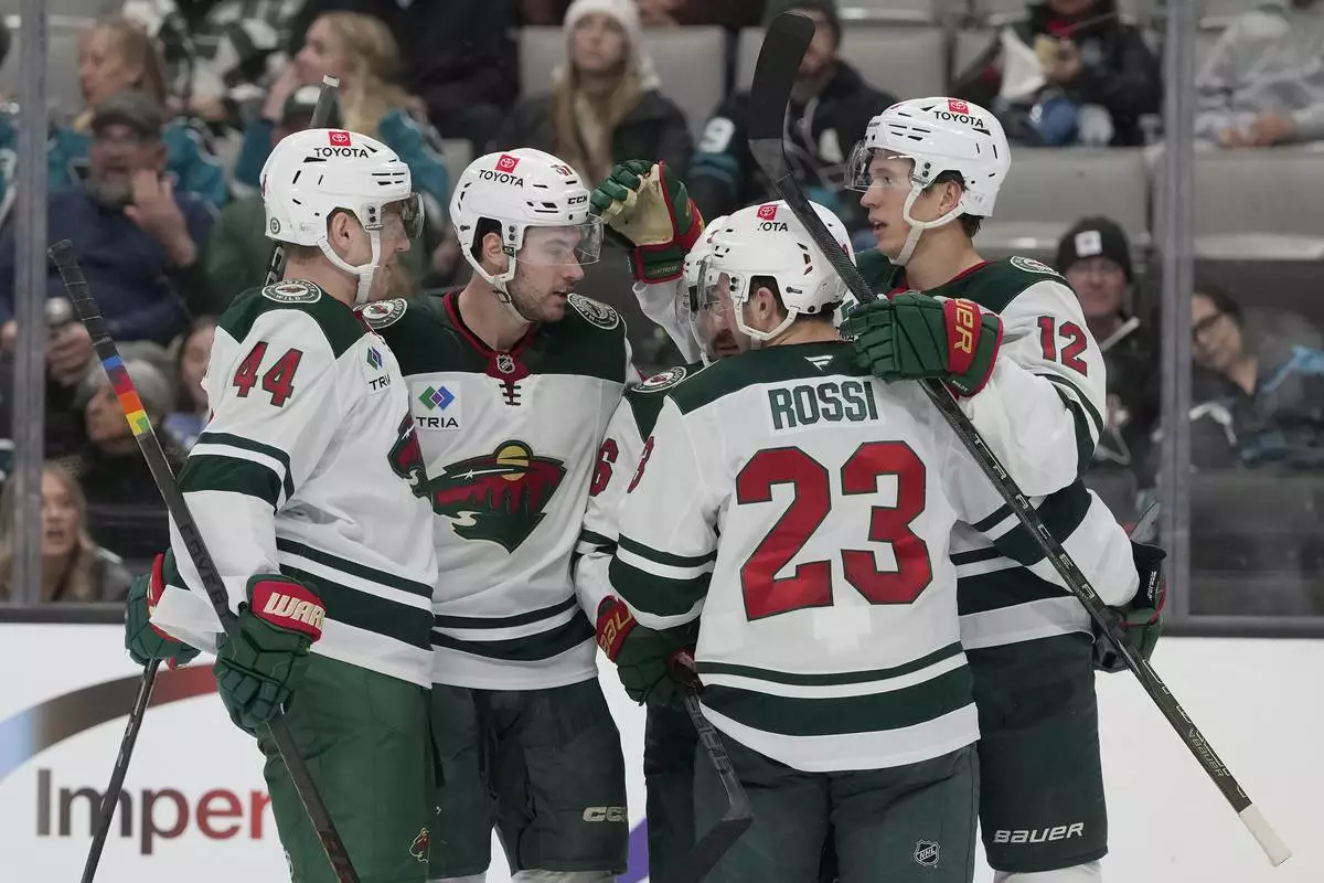 Minnesota Wild left wing Matt Boldy, right, is congratulated by teammates after scoring against the San Jose Sharks during the second period of an NHL hockey game in San Jose, Calif., Saturday, Jan. 11, 2025. (AP Photo/Jeff Chiu)