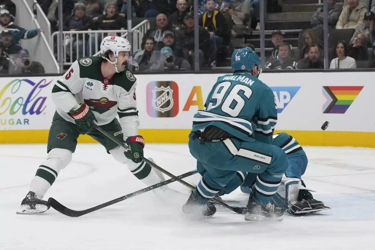 Minnesota Wild defenseman Jake Middleton, left, misses a shot against San Jose Sharks defenseman Jake Walman (96) and goaltender Yaroslav Askarov, back right, during the second period of an NHL hockey game in San Jose, Calif., Saturday, Jan. 11, 2025. (AP Photo/Jeff Chiu)