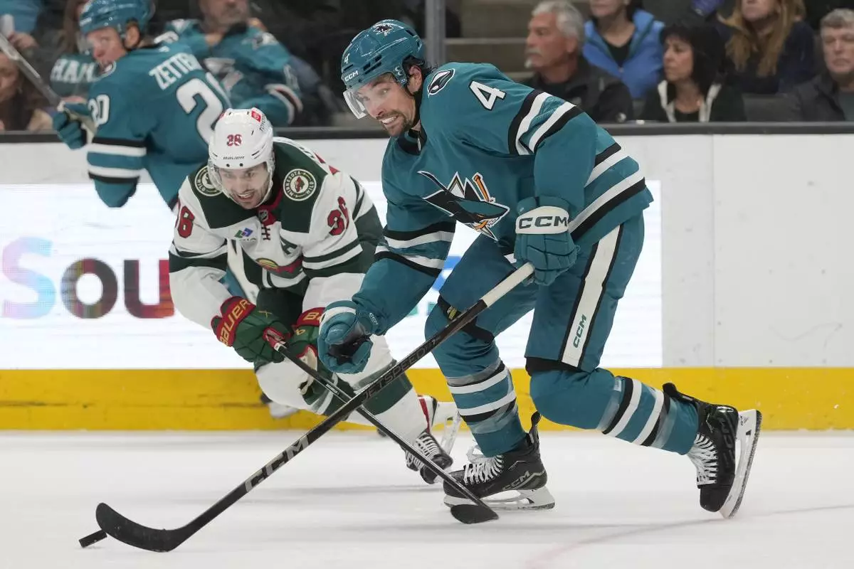 San Jose Sharks defenseman Cody Ceci (4) skates with the puck against Minnesota Wild right wing Mats Zuccarello (36) during the second period of an NHL hockey game in San Jose, Calif., Saturday, Jan. 11, 2025. (AP Photo/Jeff Chiu)