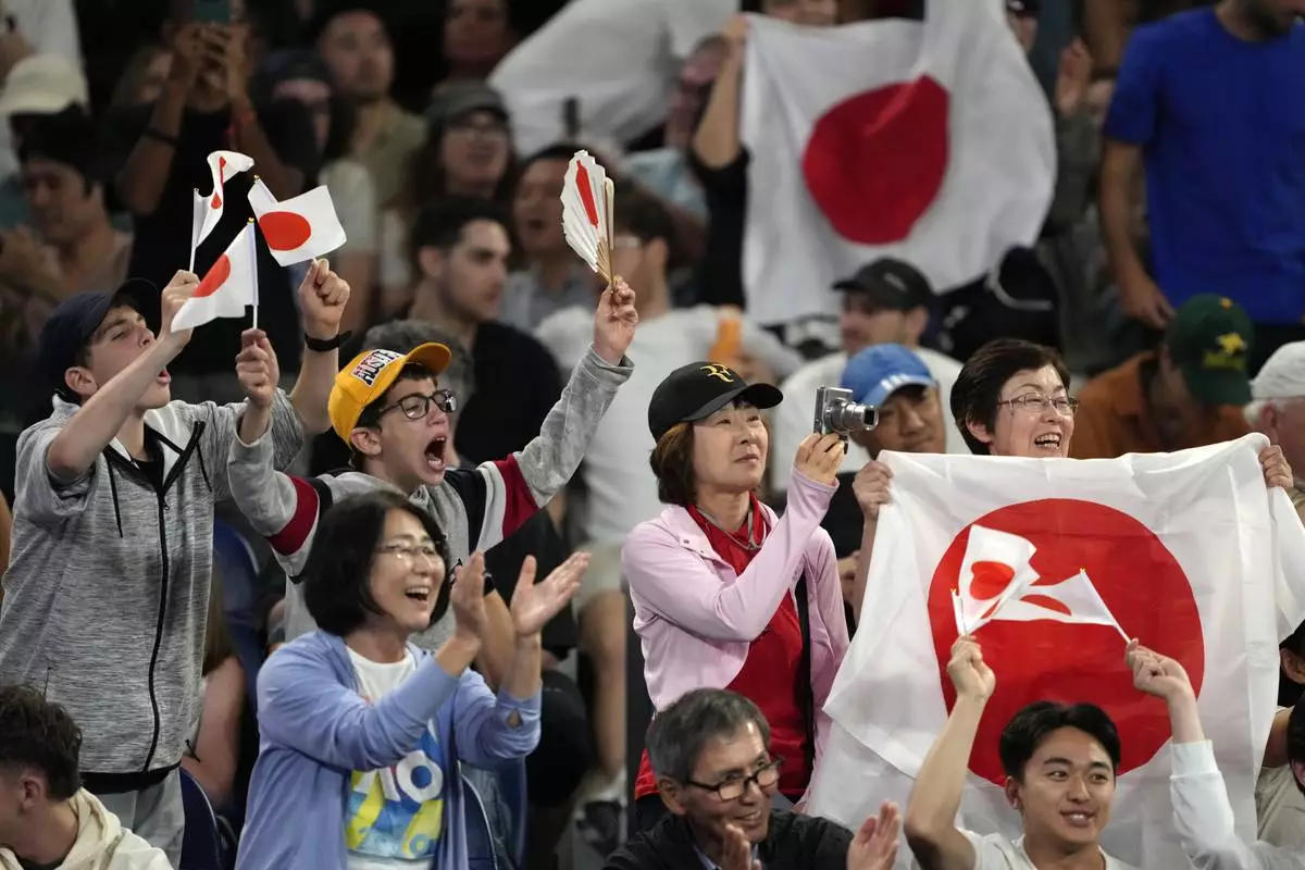 Supporters of Japan's Kei Nishikori react during his first round match against Thiago Monteiro of Brazil at the Australian Open tennis championship in Melbourne, Australia, Sunday, Jan. 12, 2025. (AP Photo/Ng Han Guan)
