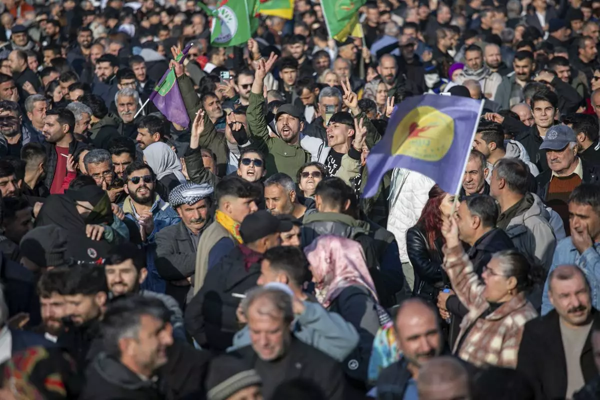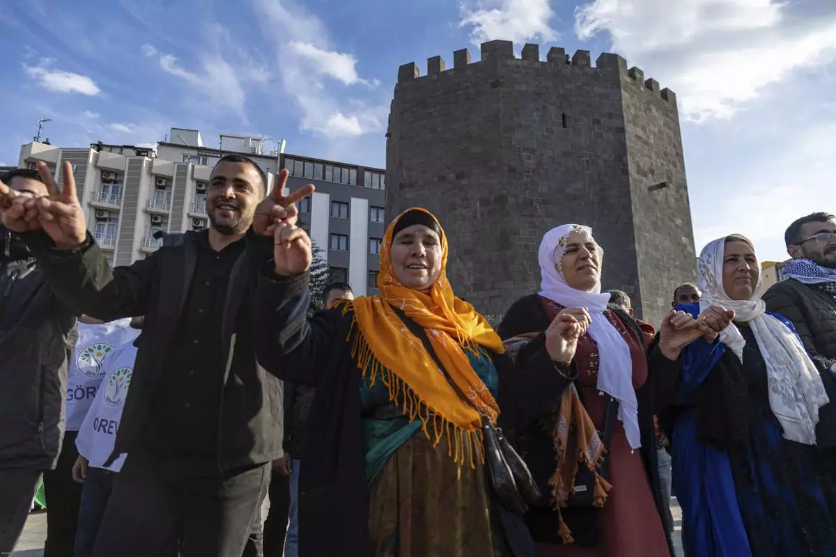 Kurdish people dance as they gather to watch live on a tv screen a Pro-Kurdish Peoples' Equality and Democracy Party, or DEM, delegation members releasing an statement from the jailed leader of the rebel Kurdistan Workers' Party, or PKK, Abdullah Ocalan, in Diyarbakir, Turkey, Thursday, Feb. 27, 2025. (AP Photo/Metin Yoksu)