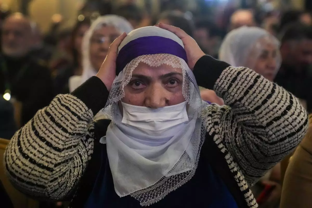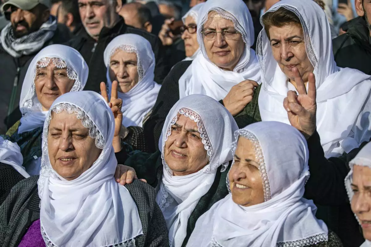 Kurdish women gather to watch live on a tv screen a Pro-Kurdish Peoples' Equality and Democracy Party, or DEM, delegation members releasing an statement from the jailed leader of the rebel Kurdistan Workers' Party, or PKK, Abdullah Ocalan, in Diyarbakir, Turkey, Thursday, Feb. 27, 2025. (AP Photo/Metin Yoksu)
